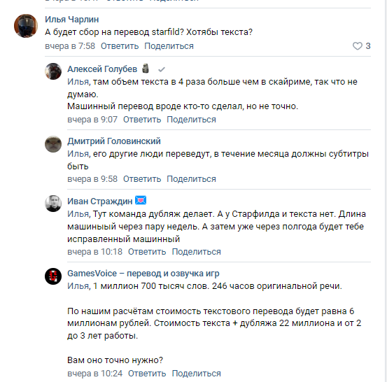 Думаю тут форум не для того что бы игру хвалить или ругать)) Добрые люди купили и нам отдали так что пользуемся и говорим спасибо Тодду за санкции)) Теперь по поводу "GamesVoice уже много раз писали, что озвучивать эту игру не будут. Очень долго всё это будет и денег очень много на это надо. " у меня только один вопрос - дорого это сколько? Если 30 млн.р то пусть кинут клич и думаю за пару недель соберут а по поводу долго так это если медленно работать то и получается долго)) Но моё мнение что судя по тому что я видел в трансляциях на твиче и ютубе не надо этой игре перевод речи т.к игра получилась скажем так странная выход которой думаю больше всего ждали в отличии от Киберпанка 2077 не игроки а Беседка и Майки))