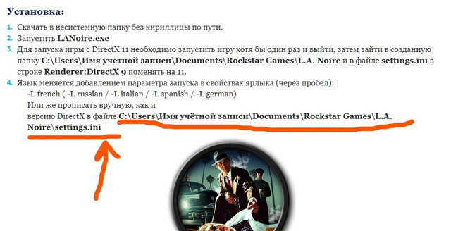 - Для запуска игры с DirectX 11 необходимо запустить игру хотя бы один раз и выйти, затем зайти в созданную папку C:\Users\Имя учётной записи\Documents\Rockstar Games\L.A. Noire и в файле settings.ini в строке Renderer:DirectX 9 поменять на 11.
