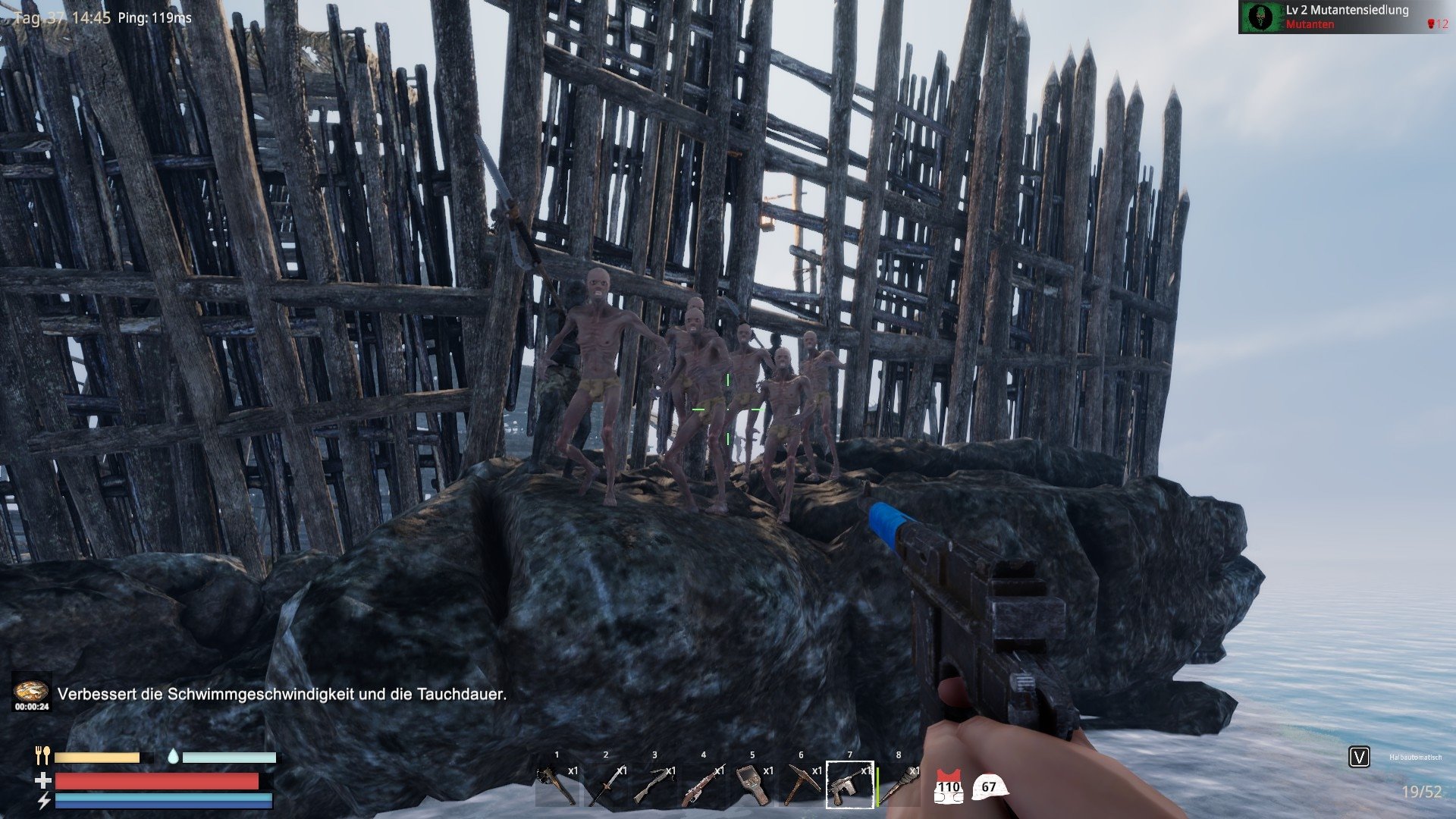 Создавайте все, что вам нужно: инструменты, оружие, гидроцикл и даже вертолет. Вам понадобятся различные станции и чертежи для создания сложных предметов.