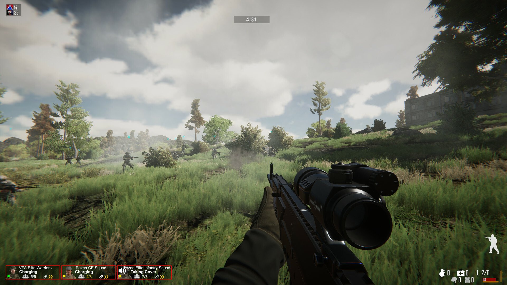 - Реалистичная симуляция боев. Главный принцип игры – реализм. Убить сотню противников одним лишь пистолетом попросту невозможно. Вам будет противостоять довольно сложный ИИ, способный проворачивать неожиданные манёвры вроде захода с флангов, окружения, ложного отступления и других приёмов, применяемых в реальных боях. Только тщательно спланированная тактика, умело подобранная экипировка и взаимодействие между отрядами помогут вам одержать победу. Готовы ли вы показать себя?