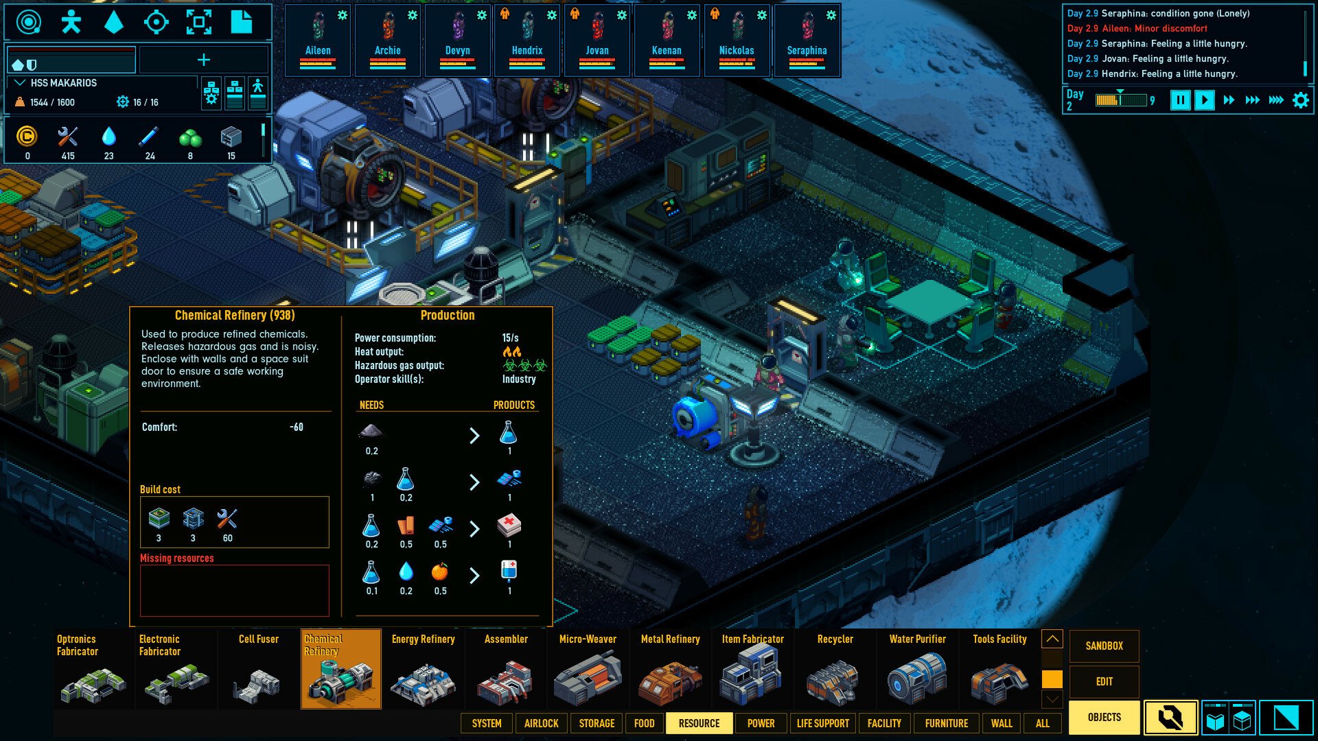- Настроение: для полного счастья членам команды необходимы еда, сон, комфорт, безопасность и друзья. Если чего-то не хватает, их настроение начнёт ухудшаться.
