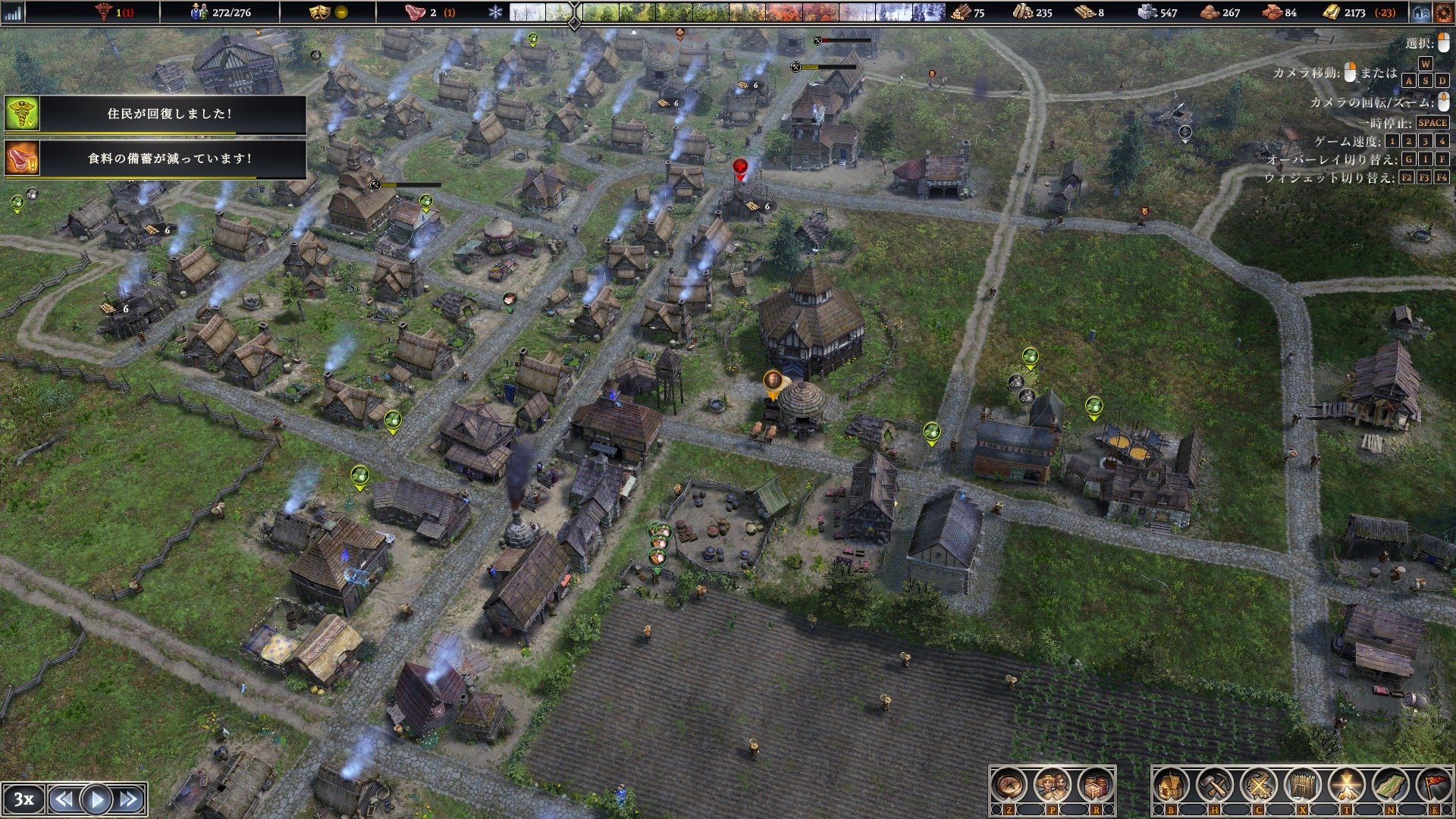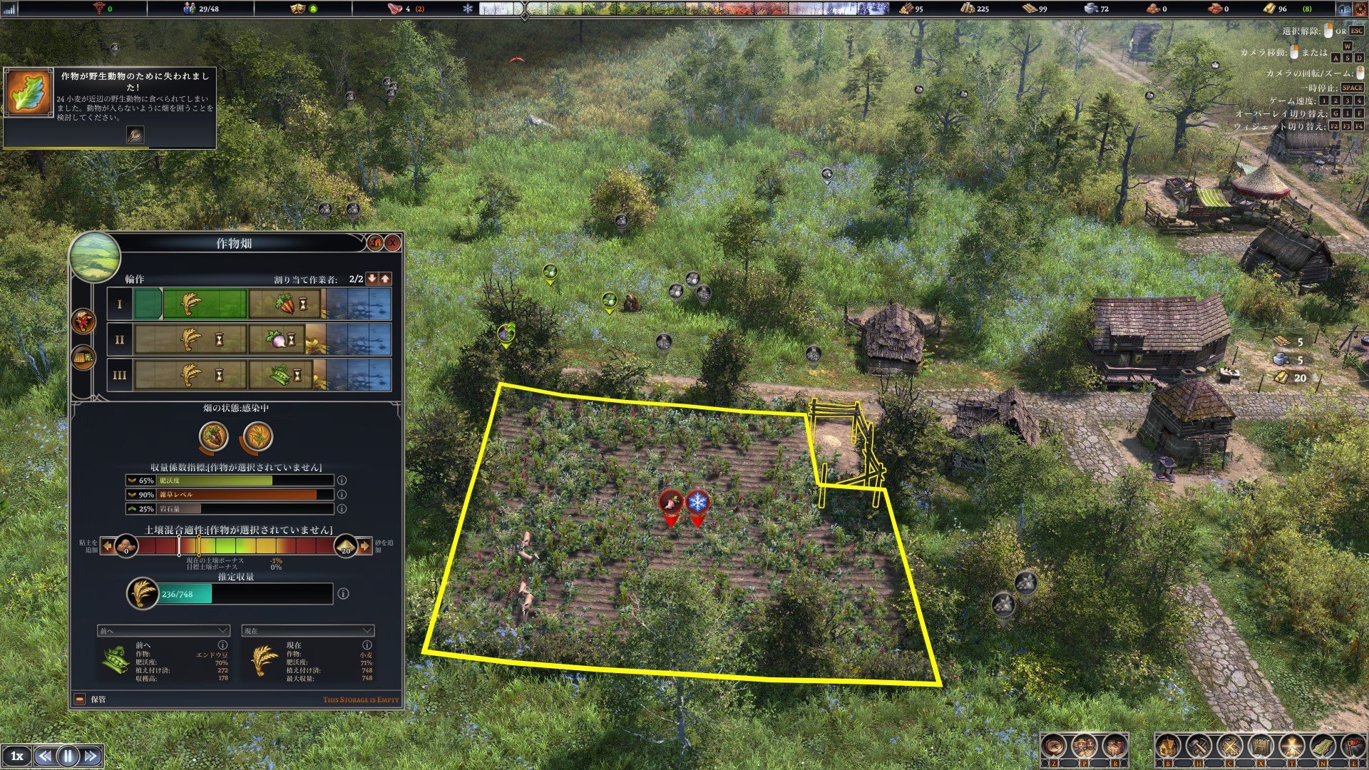 - Развитая система сельского хозяйства. Выбирайте из 10 видов сельскохозяйственных культур с разными характеристиками и организуйте севооборот, чтобы сохранить плодородность почвы, не потерять урожай из-за засухи или заморозков и предотвратить болезни растений. Возделывайте поля, удаляйте сорняки и камни, повышайте плодородность и регулируйте состав почв, чтобы получить максимальный урожай и накормить население.