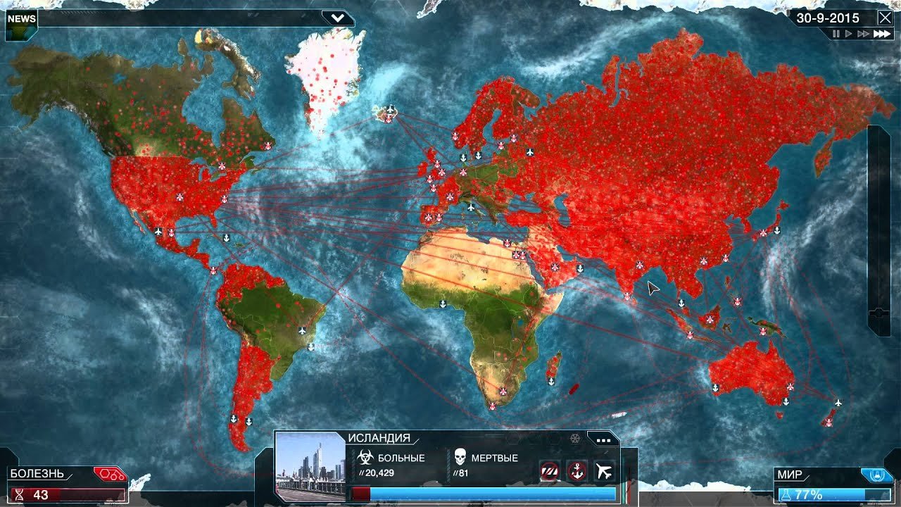 - Статистика заболеваний — данные, графики, возможность наблюдать за заражением и уровнями смертности, отслеживать реакцию правительства и попытки излечения, а также оценить успех (или неуспех) болезни, изучив повтор игры.